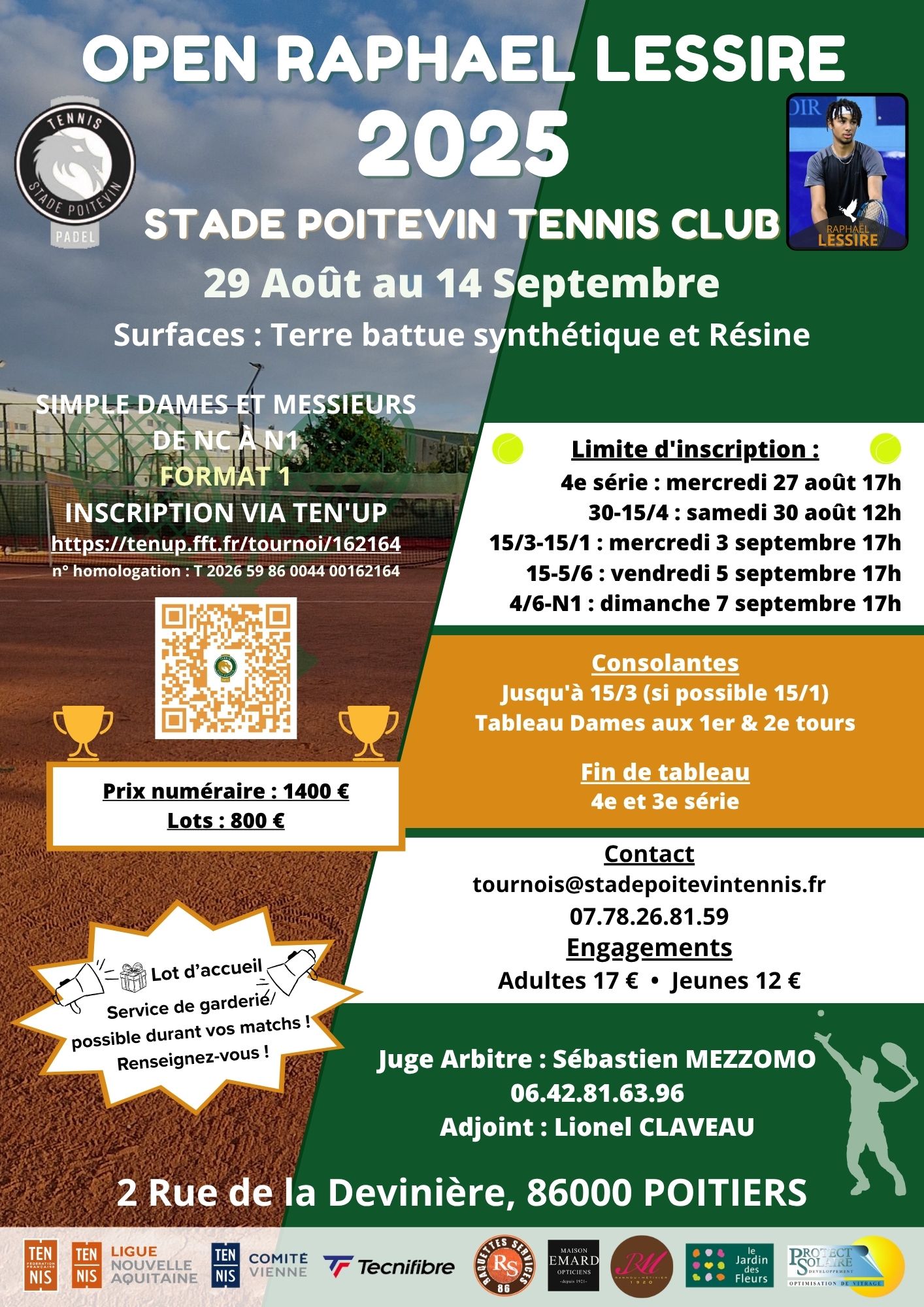 Pour toutes questions, vous pouvez contacter le Juge Arbitre Sébastien Mezzomo au 06 42 81 63 96, le Juge Arbitre adjoint Lionel Claveau au 06 80 23 77 17 et le directeur du tournoi Etienne Langlois au 07 78 26 81 59.