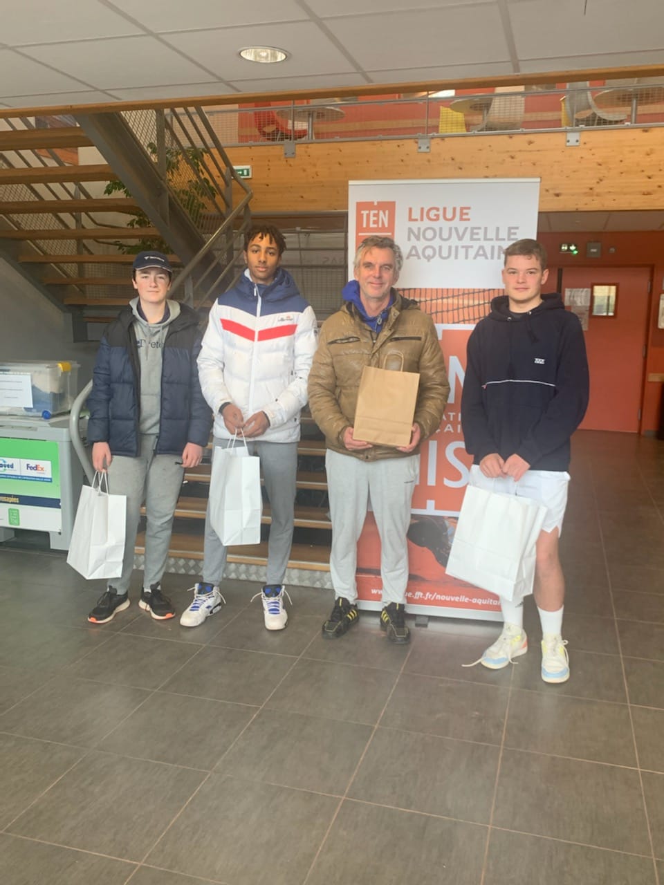 Raphaël a assumé son rôle de N°1, ce qui n’est jamais facile , en gagnant ses trois simples face à des 4/6 , 3/6 et 2/6 , tandis que Pacôme et Titouan ne pouvaient rien faire contre des joueurs mieux classés, sinon en profiter pour prendre de l’expérience sous la houlette de leur coach Jean Baptiste Bollée.